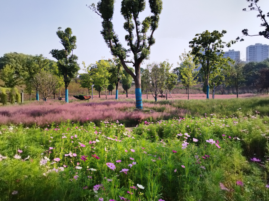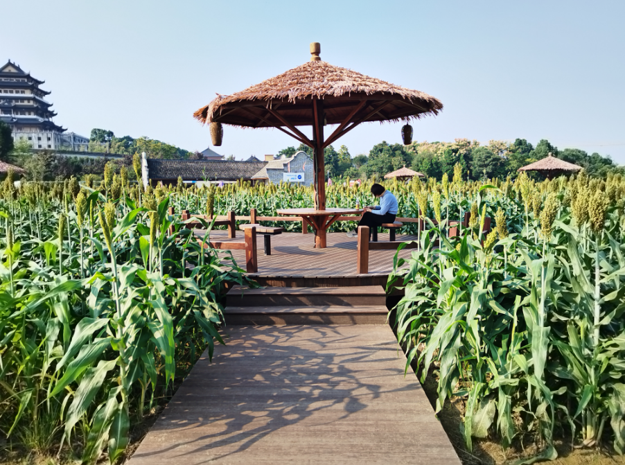 奉化仁湖農(nóng)趣園是集生態(tài)防護(hù)、景觀觀賞、農(nóng)田種植、休閑健身、文化娛樂(lè)等功能于一體的大型城市森林公園。公園整體設(shè)計(jì)按照“山為實(shí),水為虛”的古代山水理念,獨(dú)具匠心地體現(xiàn)奉化所特有的山水人文特色和彌勒佛教文化。一走進(jìn)園區(qū)大門(mén),成片的高粱地與水稻田交相輝映,整齊劃一,一個(gè)個(gè)高粱穗,似一只只火把,伸向藍(lán)天,訴說(shuō)著豐收的喜悅。木質(zhì)連廊將高粱地分割得錯(cuò)落有致,大家登上連廊,在周?chē)吡淮負(fù)硐拢娂娔贸鍪謾C(jī)與高粱來(lái)個(gè)親密接觸,記錄著美麗瞬間。在園區(qū)內(nèi)還有農(nóng)作物科普小知識(shí),大家駐足閱覽,仿佛身在城里的我們走進(jìn)了鄉(xiāng)間田野。